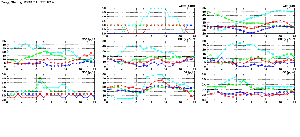 | Air Quality Data Time Series in Tung Chung (2021/10/14) | ( Line colors: Day -3 Day -2 Day -1 Current day ) | 2D Map Current AQHI |