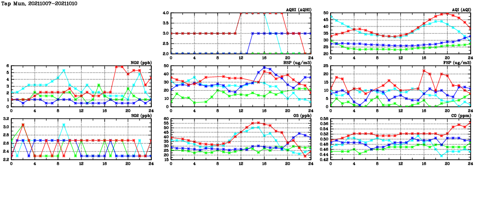 | Air Quality Data Time Series in Tap Mun (2021/10/10) | ( Line colors: Day -3 Day -2 Day -1 Current day ) | 2D Map Current AQHI |