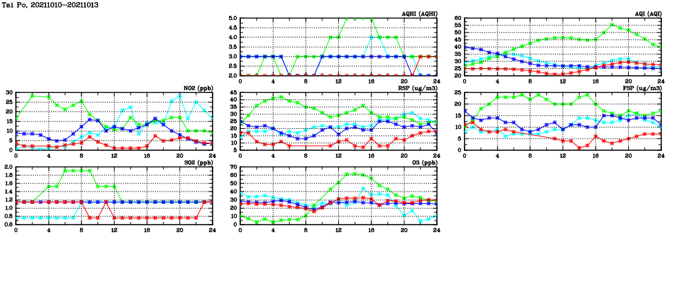 | Air Quality Data Time Series in Tai Po (2021/10/13) | ( Line colors: Day -3 Day -2 Day -1 Current day ) | 2D Map Current AQHI |