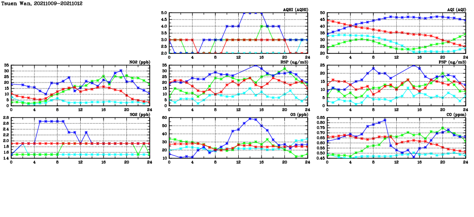 | Air Quality Data Time Series in Tsuen Wan (2021/10/12) | ( Line colors: Day -3 Day -2 Day -1 Current day ) | 2D Map Current AQHI |