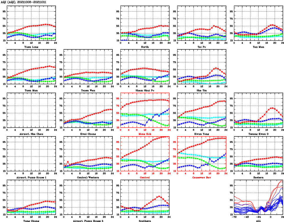 | Air Quality Data Time Series for AQI (2021/10/11) | ( Line colors: Day -3 Day -2 Day -1 Current day ) | 2D Map Current AQHI |