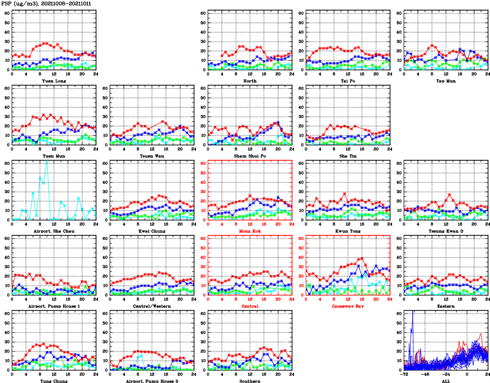 | Air Quality Data Time Series for FSP (2021/10/11) | ( Line colors: Day -3 Day -2 Day -1 Current day ) | 2D Map Current AQHI |
