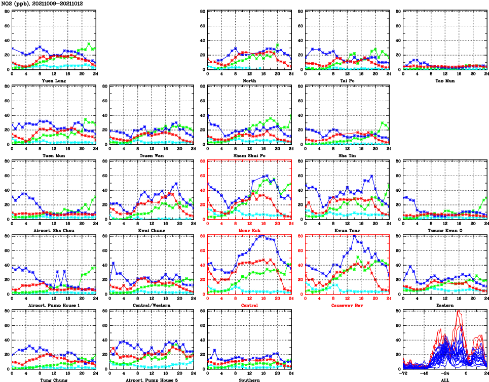 | Air Quality Data Time Series for NO2 (2021/10/12) | ( Line colors: Day -3 Day -2 Day -1 Current day ) | 2D Map Current AQHI |