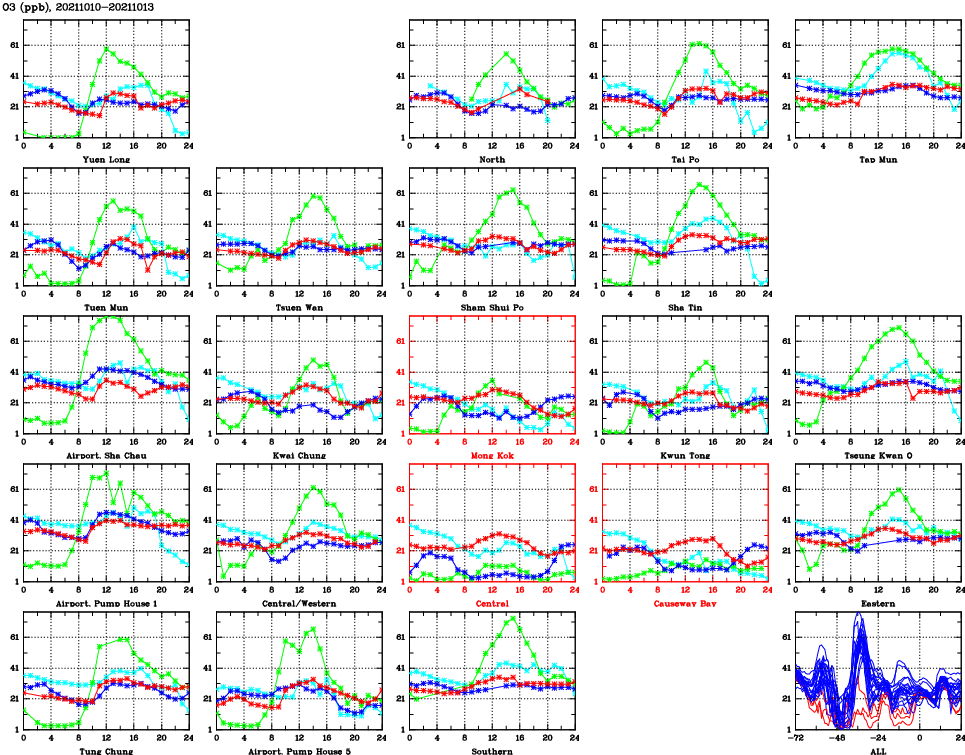 | Air Quality Data Time Series for O3 (2021/10/13) | ( Line colors: Day -3 Day -2 Day -1 Current day ) | 2D Map Current AQHI |
