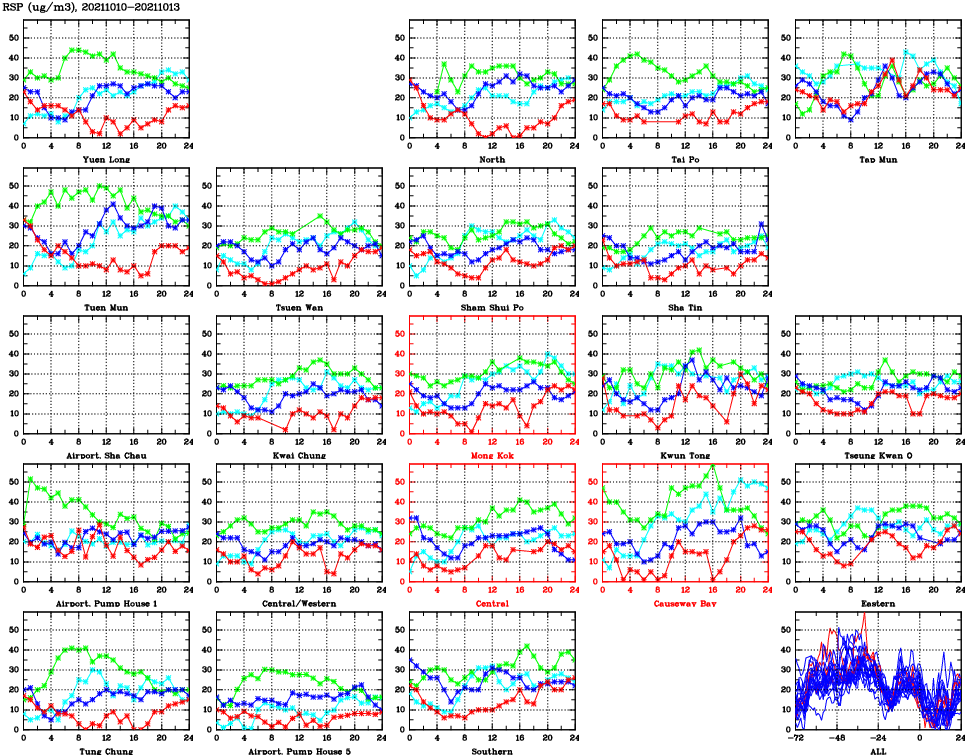 | Air Quality Data Time Series for RSP (2021/10/13) | ( Line colors: Day -3 Day -2 Day -1 Current day ) | 2D Map Current AQHI |