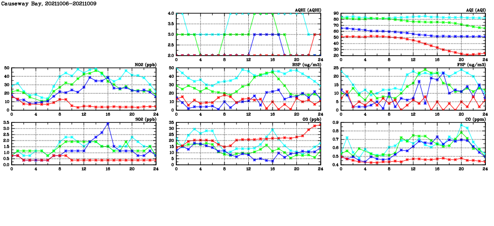 | Air Quality Data Time Series in Causeway Bay (2021/10/09) | ( Line colors: Day -3 Day -2 Day -1 Current day ) | 2D Map Current AQHI |