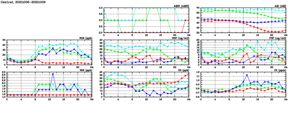 | Air Quality Data Time Series in Central (2021/10/09) | ( Line colors: Day -3 Day -2 Day -1 Current day ) | 2D Map Current AQHI |