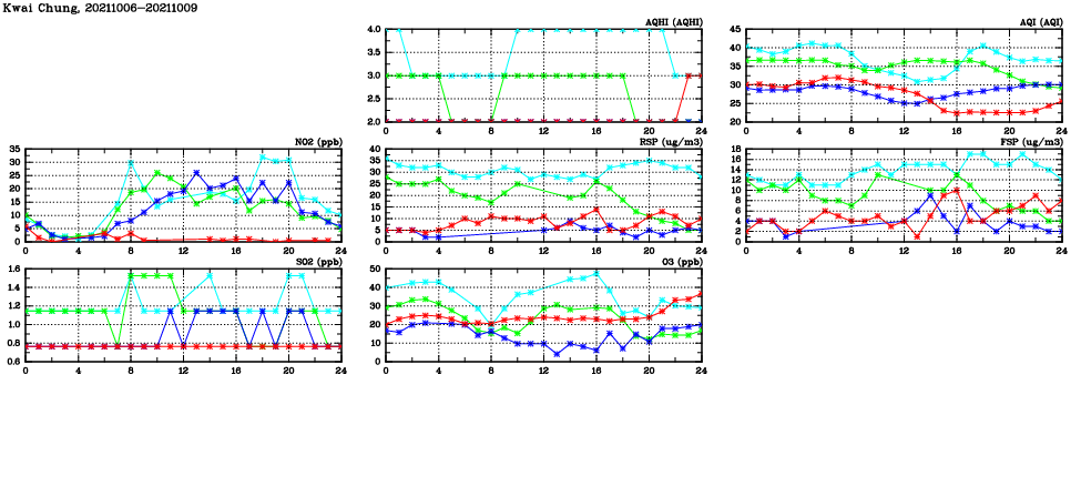 | Air Quality Data Time Series in Kwai Chung (2021/10/09) | ( Line colors: Day -3 Day -2 Day -1 Current day ) | 2D Map Current AQHI |
