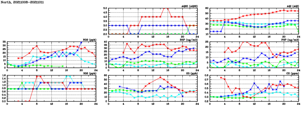 | Air Quality Data Time Series in North (2021/10/11) | ( Line colors: Day -3 Day -2 Day -1 Current day ) | 2D Map Current AQHI |