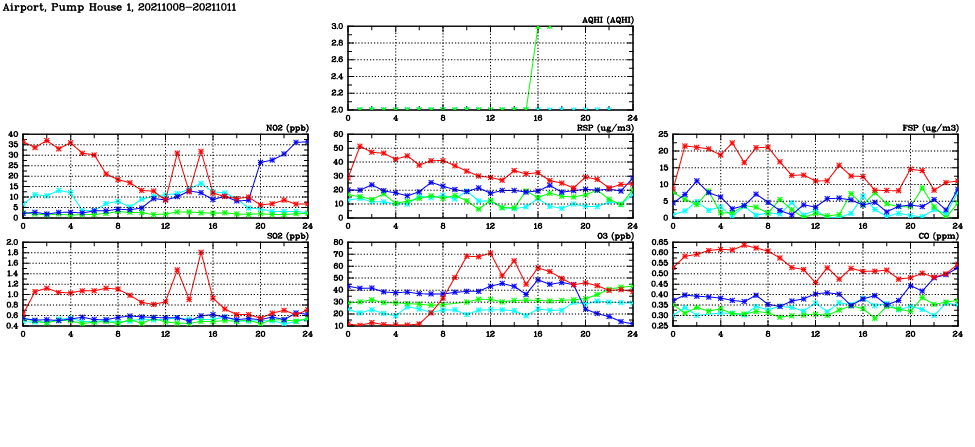 | Air Quality Data Time Series in Airport, Pump House 1 (2021/10/11) | ( Line colors: Day -3 Day -2 Day -1 Current day ) | 2D Map Current AQHI |