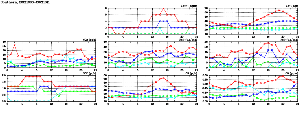 | Air Quality Data Time Series in Southern (2021/10/11) | ( Line colors: Day -3 Day -2 Day -1 Current day ) | 2D Map Current AQHI |