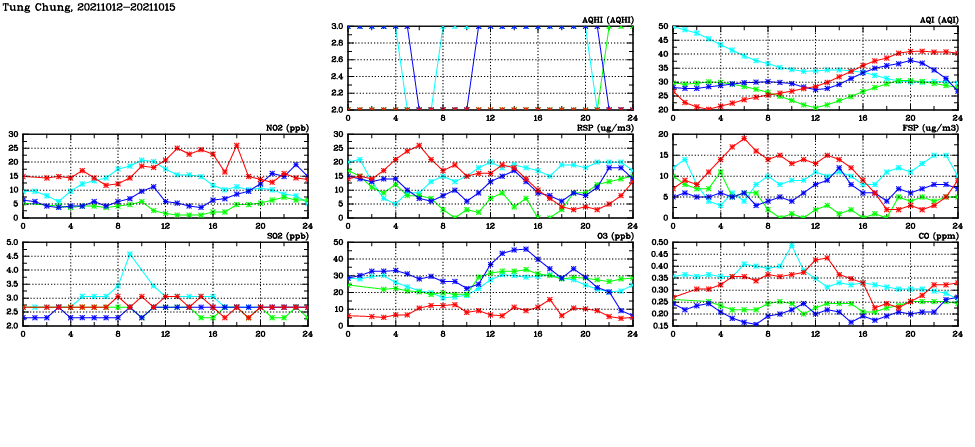 | Air Quality Data Time Series in Tung Chung (2021/10/15) | ( Line colors: Day -3 Day -2 Day -1 Current day ) | 2D Map Current AQHI |