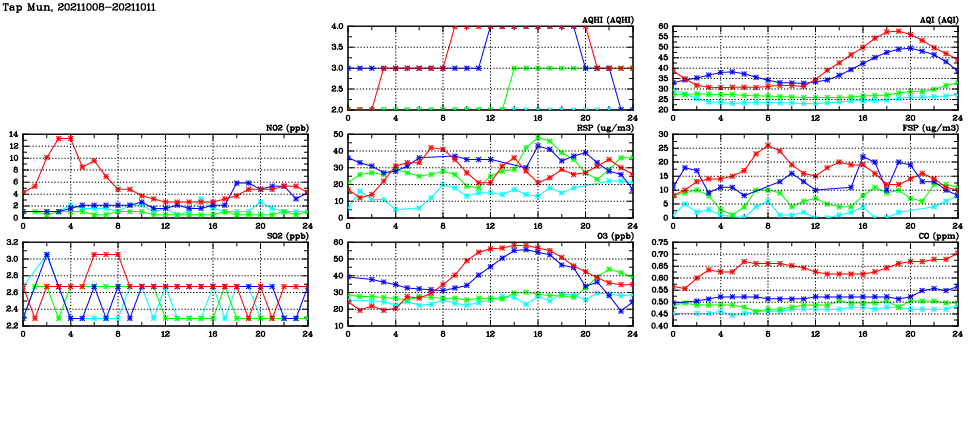 | Air Quality Data Time Series in Tap Mun (2021/10/11) | ( Line colors: Day -3 Day -2 Day -1 Current day ) | 2D Map Current AQHI |