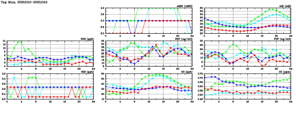 | Air Quality Data Time Series in Tap Mun (2021/10/13) | ( Line colors: Day -3 Day -2 Day -1 Current day ) | 2D Map Current AQHI |