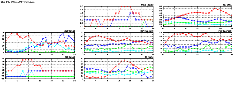 | Air Quality Data Time Series in Tai Po (2021/10/11) | ( Line colors: Day -3 Day -2 Day -1 Current day ) | 2D Map Current AQHI |