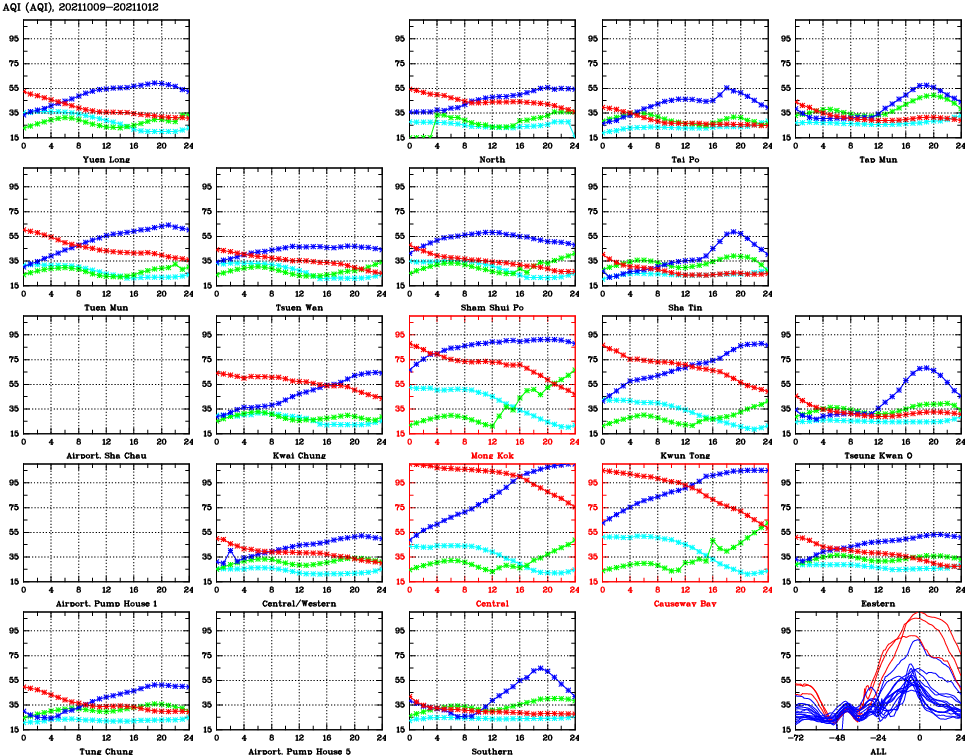 | Air Quality Data Time Series for AQI (2021/10/12) | ( Line colors: Day -3 Day -2 Day -1 Current day ) | 2D Map Current AQHI |