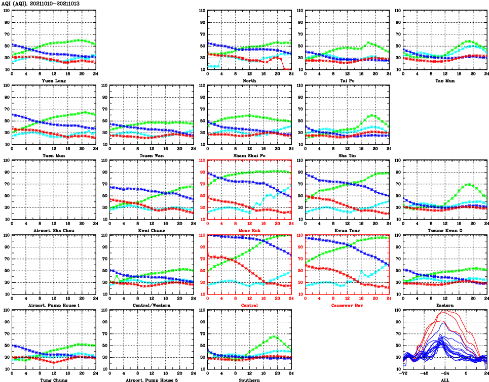 | Air Quality Data Time Series for AQI (2021/10/13) | ( Line colors: Day -3 Day -2 Day -1 Current day ) | 2D Map Current AQHI |