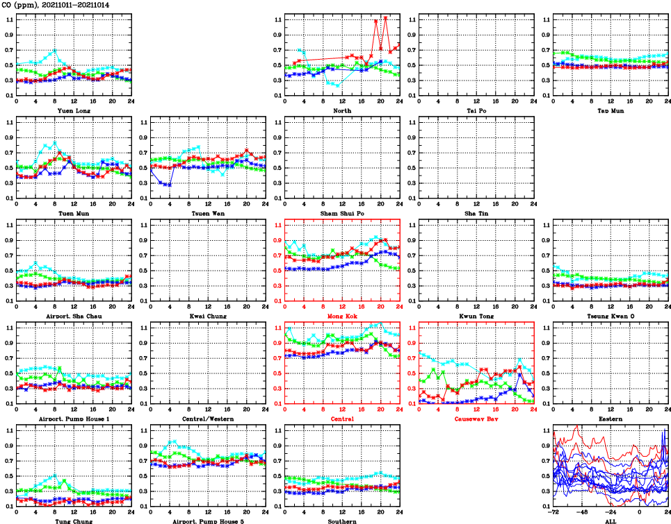 | Air Quality Data Time Series for CO (2021/10/14) | ( Line colors: Day -3 Day -2 Day -1 Current day ) | 2D Map Current AQHI |