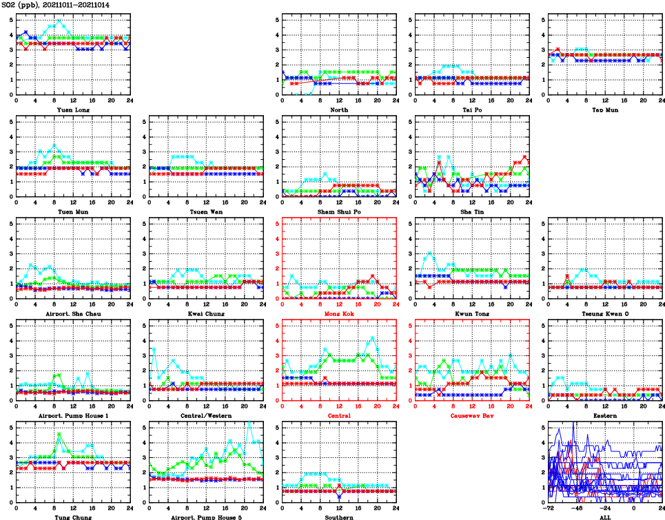 | Air Quality Data Time Series for SO2 (2021/10/14) | ( Line colors: Day -3 Day -2 Day -1 Current day ) | 2D Map Current AQHI |