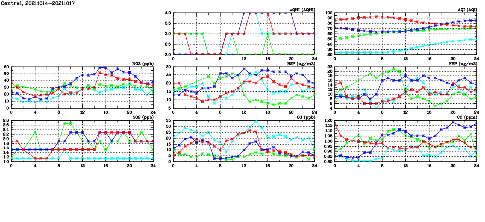 | Air Quality Data Time Series in Central (2021/10/17) | ( Line colors: Day -3 Day -2 Day -1 Current day ) | 2D Map Current AQHI |