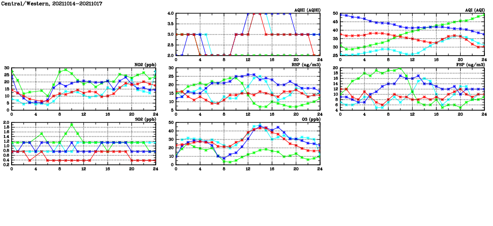 | Air Quality Data Time Series in Central/Western (2021/10/17) | ( Line colors: Day -3 Day -2 Day -1 Current day ) | 2D Map Current AQHI |