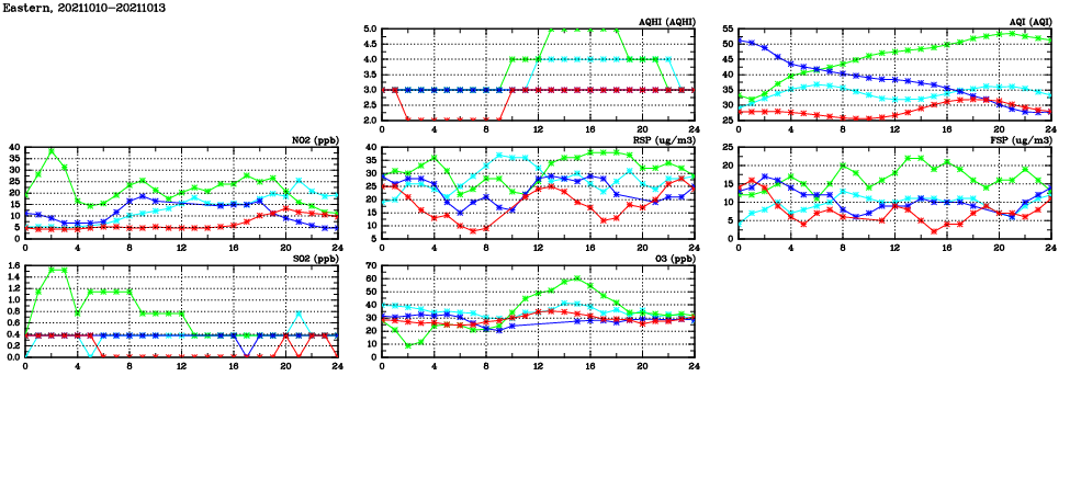 | Air Quality Data Time Series in Eastern (2021/10/13) | ( Line colors: Day -3 Day -2 Day -1 Current day ) | 2D Map Current AQHI |