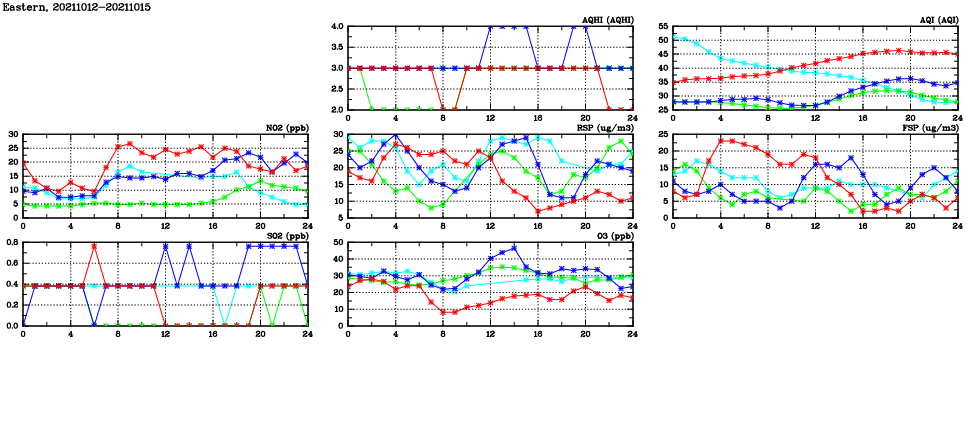 | Air Quality Data Time Series in Eastern (2021/10/15) | ( Line colors: Day -3 Day -2 Day -1 Current day ) | 2D Map Current AQHI |