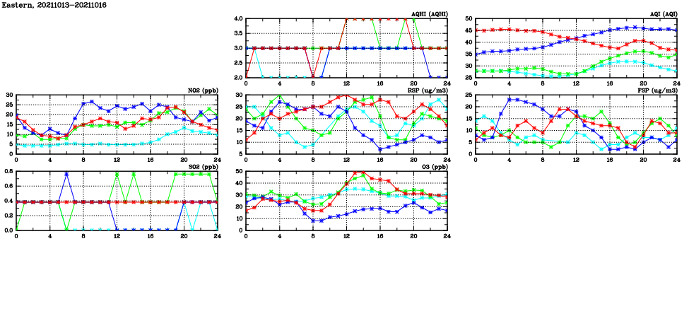 | Air Quality Data Time Series in Eastern (2021/10/16) | ( Line colors: Day -3 Day -2 Day -1 Current day ) | 2D Map Current AQHI |