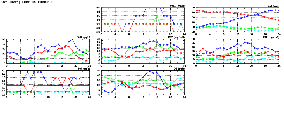 | Air Quality Data Time Series in Kwai Chung (2021/10/12) | ( Line colors: Day -3 Day -2 Day -1 Current day ) | 2D Map Current AQHI |