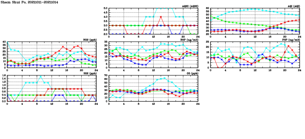 | Air Quality Data Time Series in Sham Shui Po (2021/10/14) | ( Line colors: Day -3 Day -2 Day -1 Current day ) | 2D Map Current AQHI |