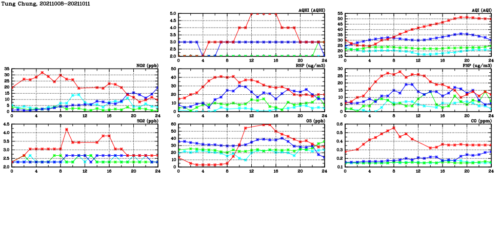 | Air Quality Data Time Series in Tung Chung (2021/10/11) | ( Line colors: Day -3 Day -2 Day -1 Current day ) | 2D Map Current AQHI |
