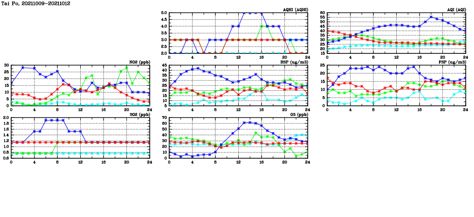| Air Quality Data Time Series in Tai Po (2021/10/12) | ( Line colors: Day -3 Day -2 Day -1 Current day ) | 2D Map Current AQHI |