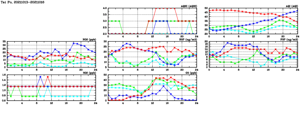 | Air Quality Data Time Series in Tai Po (2021/10/16) | ( Line colors: Day -3 Day -2 Day -1 Current day ) | 2D Map Current AQHI |