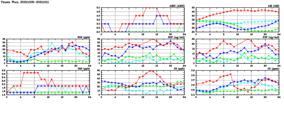 | Air Quality Data Time Series in Tsuen Wan (2021/10/11) | ( Line colors: Day -3 Day -2 Day -1 Current day ) | 2D Map Current AQHI |
