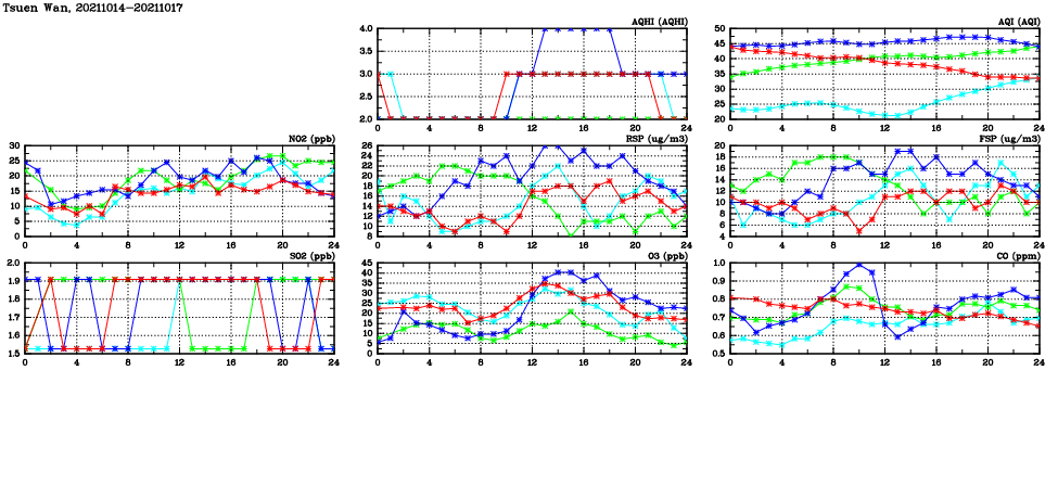 | Air Quality Data Time Series in Tsuen Wan (2021/10/17) | ( Line colors: Day -3 Day -2 Day -1 Current day ) | 2D Map Current AQHI |