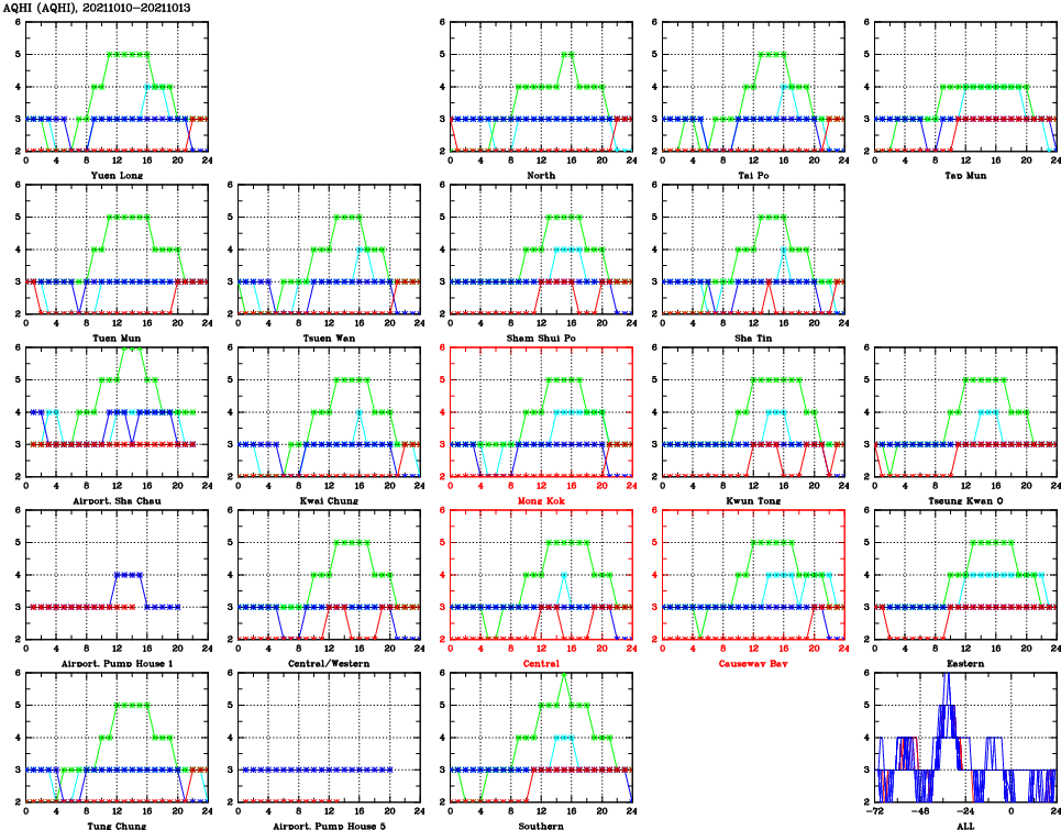 | Air Quality Data Time Series for AQHI (2021/10/13) | ( Line colors: Day -3 Day -2 Day -1 Current day ) | 2D Map Current AQHI |
