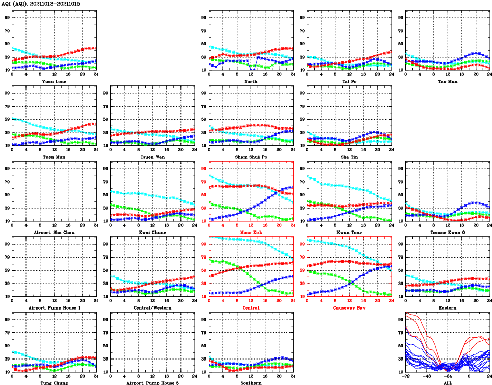 | Air Quality Data Time Series for AQI (2021/10/15) | ( Line colors: Day -3 Day -2 Day -1 Current day ) | 2D Map Current AQHI |