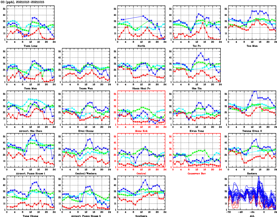 | Air Quality Data Time Series for O3 (2021/10/15) | ( Line colors: Day -3 Day -2 Day -1 Current day ) | 2D Map Current AQHI |