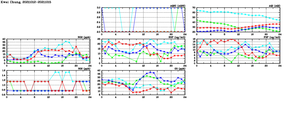 | Air Quality Data Time Series in Kwai Chung (2021/10/15) | ( Line colors: Day -3 Day -2 Day -1 Current day ) | 2D Map Current AQHI |