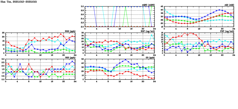 | Air Quality Data Time Series in Sha Tin (2021/10/15) | ( Line colors: Day -3 Day -2 Day -1 Current day ) | 2D Map Current AQHI |