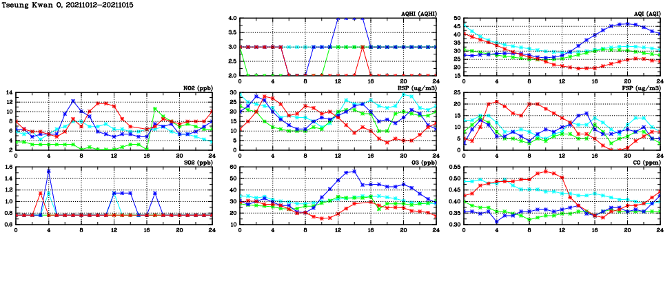 | Air Quality Data Time Series in Tseung Kwan O (2021/10/15) | ( Line colors: Day -3 Day -2 Day -1 Current day ) | 2D Map Current AQHI |