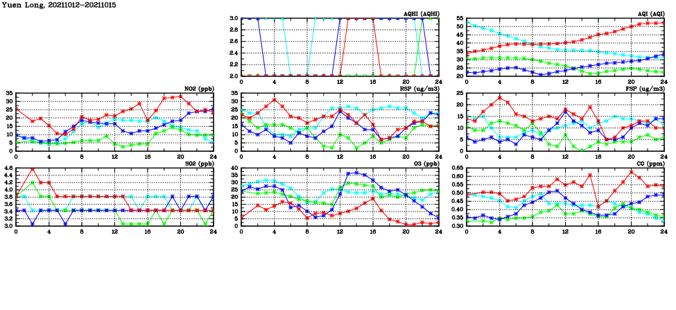 | Air Quality Data Time Series in Yuen Long (2021/10/15) | ( Line colors: Day -3 Day -2 Day -1 Current day ) | 2D Map Current AQHI |