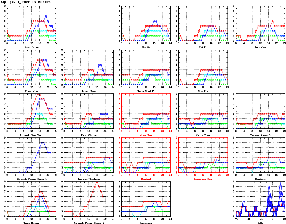 | Air Quality Data Time Series for AQHI (2021/10/19) | ( Line colors: Day -3 Day -2 Day -1 Current day ) | 2D Map Current AQHI |