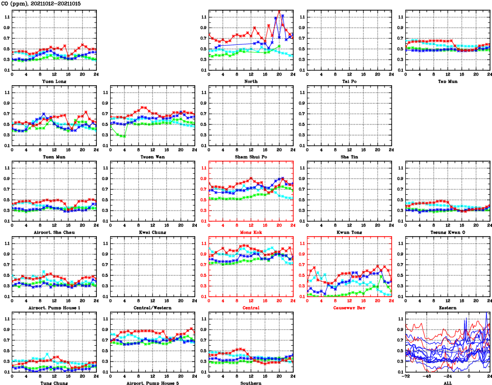 | Air Quality Data Time Series for CO (2021/10/15) | ( Line colors: Day -3 Day -2 Day -1 Current day ) | 2D Map Current AQHI |