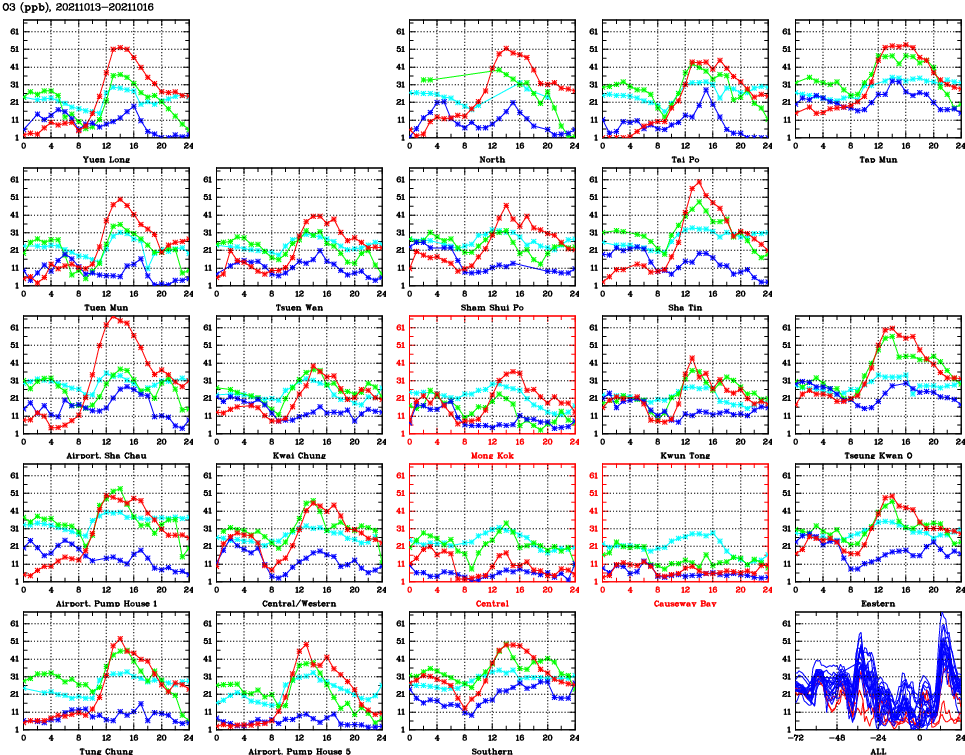 | Air Quality Data Time Series for O3 (2021/10/16) | ( Line colors: Day -3 Day -2 Day -1 Current day ) | 2D Map Current AQHI |
