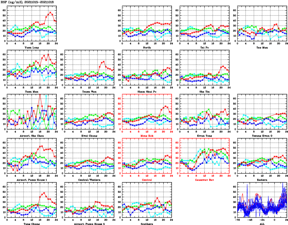 | Air Quality Data Time Series for RSP (2021/10/18) | ( Line colors: Day -3 Day -2 Day -1 Current day ) | 2D Map Current AQHI |