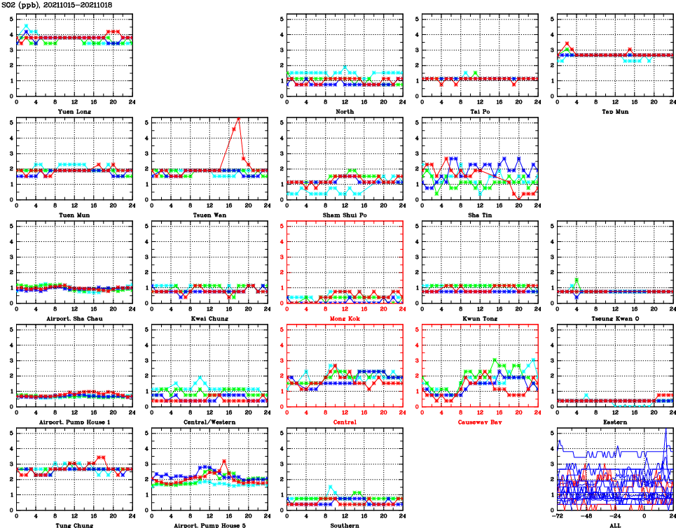 | Air Quality Data Time Series for SO2 (2021/10/18) | ( Line colors: Day -3 Day -2 Day -1 Current day ) | 2D Map Current AQHI |