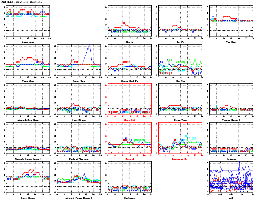| Air Quality Data Time Series for SO2 (2021/10/19) | ( Line colors: Day -3 Day -2 Day -1 Current day ) | 2D Map Current AQHI |