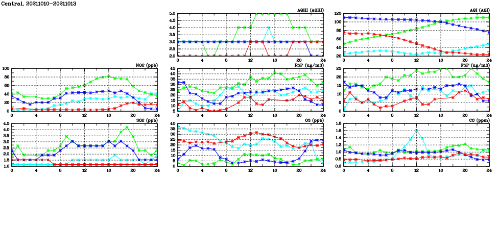 | Air Quality Data Time Series in Central (2021/10/13) | ( Line colors: Day -3 Day -2 Day -1 Current day ) | 2D Map Current AQHI |