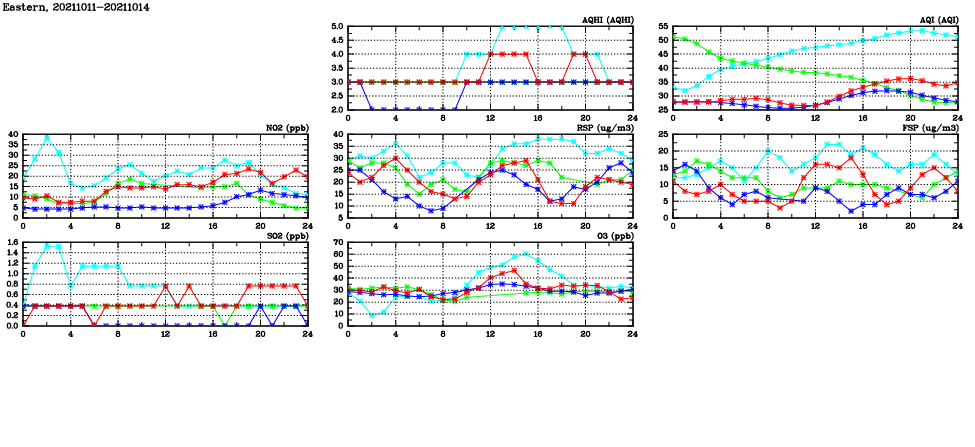 | Air Quality Data Time Series in Eastern (2021/10/14) | ( Line colors: Day -3 Day -2 Day -1 Current day ) | 2D Map Current AQHI |